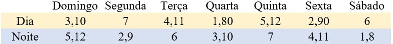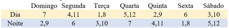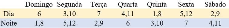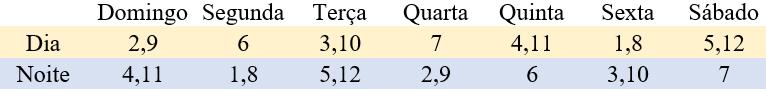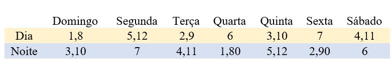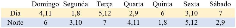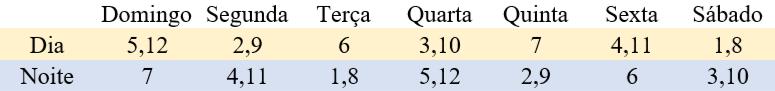 Horário comum (todos os dias da semana): Sitael (00:40-01:00), Lehahel (01:40-2:00), Lauviah (05:20-05:40), Omael (09:40-10:00), Lecahel (10:00-10:20), Sealiah (14:40-15:00), Poiel (18:20-18:40), Harahel (19:20-19:40), Iabamiah (23:00-23:20)