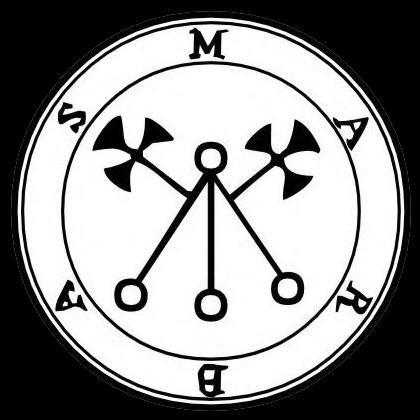 O quinto espírito é Marbas, ou Barbas. É um grande Presidente grande, que se manifesta primeiramente sob a forma de um grande leão, mas mais tarde, no pedido do mestre, ele toma forma humana. Ele responde corretamente todas as perguntas sobre coisas escon7didas ou secretas. Ele cura e causa doenças. Por outro lado, concede grande sabedoria e conhecimento em Artes Mecânicas; e pode mudar a forma dos homens. Ele governa 36 legiões dos espíritos. E seu selo é este, que deve ser preparado como foi dito acima.