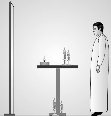 O seguinte exercício foi tirado do Curso de cabala dos Filósofos da Natureza, Lição 64. Um grande espelho é necessário para este exercício. As velas são colocadas na altura dos pés e ombros e não devem ser visíveis no espelho. A área de trabalho (oratório) deve ser escura. Execute a respiração quatro por quatro: Inspire lentamente pelo nariz contando até quatro, pause por 4 segundos, expire pela boca contando até quatro e pause por mais 4 segundos.