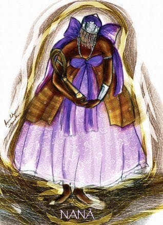 Em algumas terras da África, Nanã é chamada de Iniê e seus assentamentos (objetos sagrados) são salpicados de vermelho.