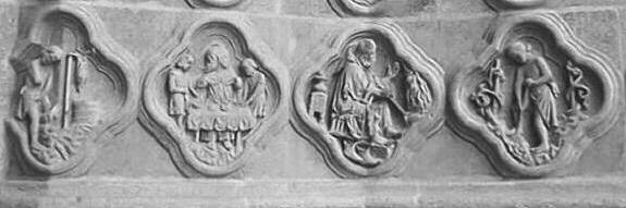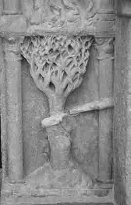 Duas árvores presentes em baixos relevos, aliás muito diferentes, ainda prendem nossa atenção. O primeiro é obviamente um carvalho, pois tem duas bolotas que são desproporcionalmente proeminentes, dado o pequeno tamanho da árvore. É provavelmente um carvalho de Kermès (“qu’Hermès”) cujos frutos aqui simbolizam os dois primeiros materiais minerais da Grande Obra Alquímica.