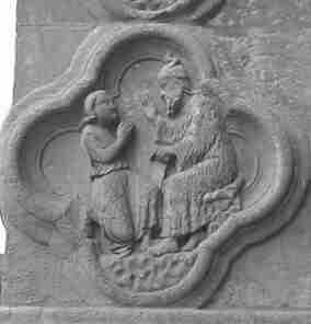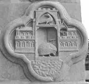 Pode-se admirar em outra quatro folhas uma cena que não sofre mais ambiguidade quanto à realidade hermética que contém. Em uma torre que toma o lugar de um atanor, notamos de fato na parte superior um pássaro onde alguns verão uma águia – obviamente sugerindo as Águias ou Sublimações da Segunda Obra – enquanto outros pensarão que podem distinguir claramente um corvo, designando a fase de putrefação do caput mortuum que sofreu a separação do mercurial “belo corpo” (corvo), ao final da Primeira Obra. Até a própria forma do edifício que preenche completamente o quatrefoil e assim determina uma cruz, designando claramente, na sua parte central, o cadinho (crux, cruz) dentro do atanor, cuja parte inferior revela um porco-espinho ou ouriço encimado por um Tau. Se sabemos que este último geralmente simboliza a Gnose ao selar a marca da Tradição, sabemos menos que é prerrogativa dos Antoninos reivindicar ser Santo-Antoine, o Eremita. Além disso, o Tau esboça aqui a forma de um malho ou de um martelo, capaz de efetuar com precisão a separação da “luz das trevas”, mencionada acima. Palais Jacques Coeur – a prima materia da Grande Obra, tanto seus espinhos interpolam com sua eloquência!”.).