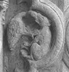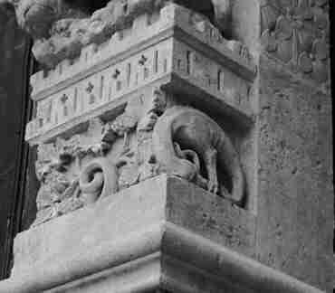 Contra o pé direito do alpendre central, encontra-se um engajado de quatro folhas, localizado logo abaixo do galo e da raposa “descritos por Fulcanelli. Lá vemos um cachorro e um pássaro (uma águia?) e voláteis – confrontando-se e agarrando-se um ao outro de uma forma muito curiosa Podemos facilmente adivinhar desta forma o símbolo hieroglífico perfeito do sal alquímico.