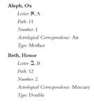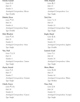 As vinte e duas letras estão divididas em três letras-mãe, sete letras duplas e doze letras simples; estes agrupamentos, como mostra a tabela, significam os elementos de fogo, água e ar; os sete planetas; e os doze signos do zodíaco. Outras correspondências incluem trunfos de tarô, cores, aromas, notas musicais, anjos, nomes divinos, Caminhos na Árvore da Vida, e partes do Cubo do Espaço. Estas correspondências se desenvolveram ao longo de mais de dois mil anos de especulação mística e prática ocultista, tanto em comunidades judaicas como não judaicas, e contêm uma boa dose de confusão interna e contradição.