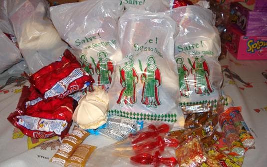Entre o dia 27 de setembro, que é o Dia de Cosme e Damião, e 12 de outubro12, dia das crianças, algumas pessoas têm o hábito de distribuir doces para as crianças como pagamento de promessas feitas aos santos. Cosme e Damião são santos católicos que foram médicos e por isso são tidos como protetores das crianças. Eles teriam exercido a medicina sem nunca cobrar nada, por isso são chamados de anargiros, ou seja, “que não são comprados por dinheiro”. Esses santos foram sincretizados com os erês13 e por isso as festas dos erês são celebradas em setembro. O padre Michelino Roberto explica que “pelo calendário oficial da igreja, a festa é celebrada no dia 26. Mas o povo prefere 27, data da inauguração da basílica que o papa Félix IV mandou erguer para os dois em Roma, no ano 500” (O ESTADO DE SÃO PAULO, 28/09/2000).