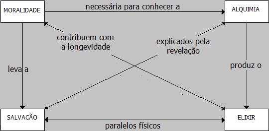 Aqui podemos ver implícita no sistema de Bacon uma íntima inter-relação entre alquimia, moralidade, prolongamento da vida e salvação. Esta matriz de ideias pode ser resumida mais claramente em um diagrama: