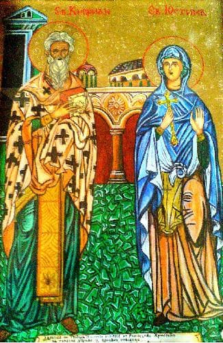 Segundo a lenda, São Cipriano de Antioquia (não confundir com Cipriano de Cartago) foi um poderoso feiticeiro contratado para seduzir magicamente uma mulher cristã, com o nome de Justina. A fé de Justina a protegeu da magia de Cipriano e, vendo a força de sua devoção, Cipriano queimou seus livros mágicos e se converteu ao cristianismo.
