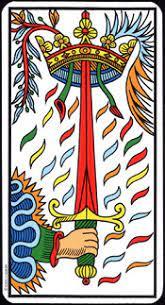 A espada, por que é amarela no VIII? se o amarelo expressa a noção de trabalho. Pode-se dizer que a espada aqui está trabalhando? Sim, como uma futura mãe: ela mostra uma cesura, ela está pronta para se separar em duas e de fato em X vemos 2 espadas, uma delas mostra uma cesura, duas espadas azuis — utilizáveis em nível coletivo.