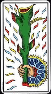 Por exemplo: a mão que segura a espada surge (sim ou não?) de um sistema de estratos, ou seja, fixo, inerte; a mão que segura a vareta sai de dentro de um sistema giratório, cujo exterior tem a aparência de uma roda dentada e, portanto, é capaz de gerar outros movimentos. A mão e a varinha constituem um sistema autônomo (não tocam as bordas da carta), e a mão e a espada um sistema relacionado ao que a cerca.