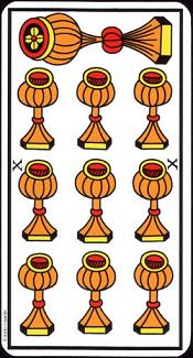 ¹¹ Isso mesmo: o Dez de Bastão: o exterior, o exterior, a cidade estrangeira. O Dez de Copa: a cidade, a vila, o país em que o querente vive. O Dez de Espada: tristeza, aflição, tristeza, lágrimas, etc. E naturalmente Dez de Ouros: dinheiro, lucro, compensação, etc.