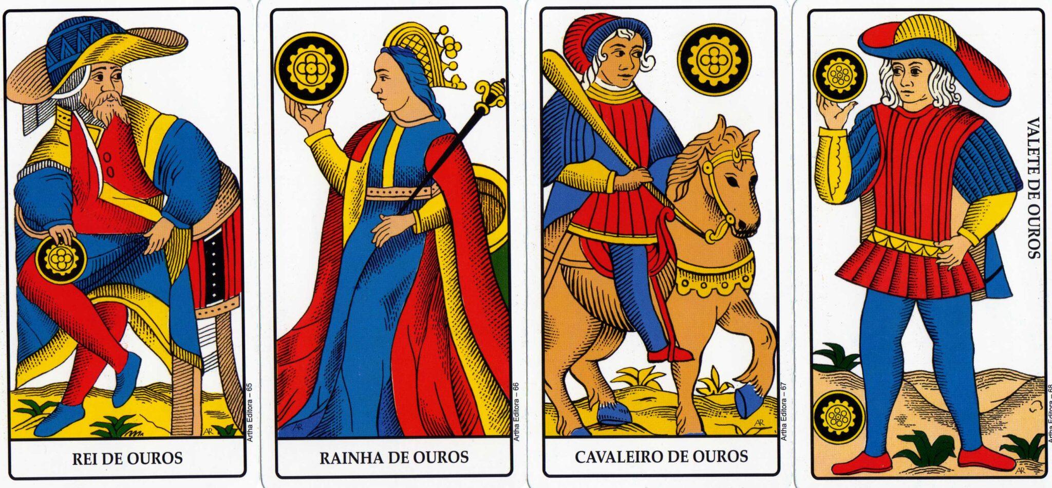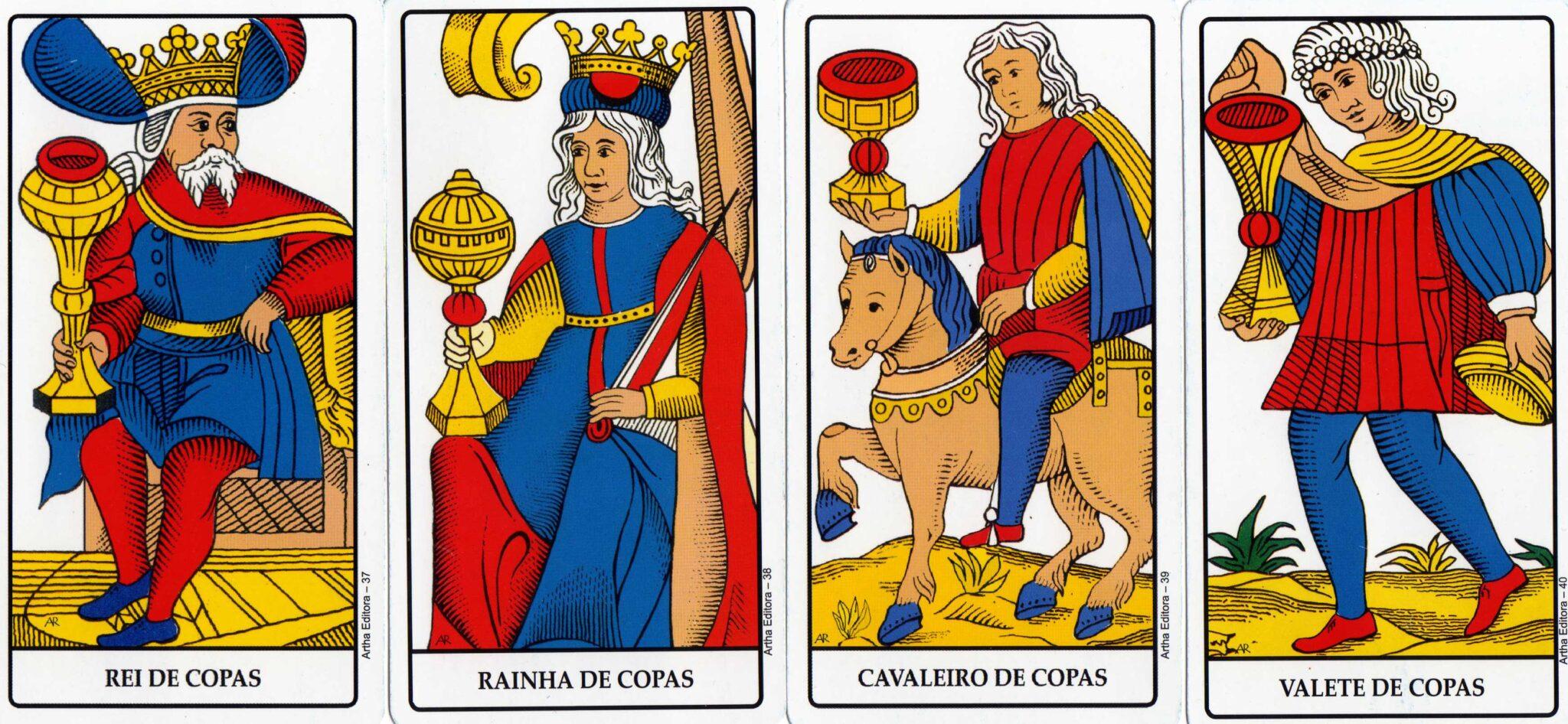 Quando você conhece bem os Reis e Rainhas visualmente, divirta-se com uma experiência emocionante. Observe primeiro que em cada família há um personagem que carrega dois utensílios, são eles a Rainha de Copas, e o Rei de Espadas, o Cavaleiro de Ouros. Mas em Bastão, os quatro têm apenas um utensílio e nas Espadas, o Valete, assim como o Rei, parece carregar dois utensílios, o que isso indica?