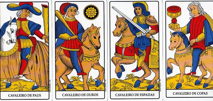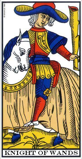 O Ouros fica melhor assentado, mais equilibrado, é coberto com capuz? Há então uma ordem entre os Cavaleiros. O Espada está bem sentado em seu animal de patas erguidas e coberto com um capacete, embora esteja um pouco pesado. O de Bastão dança com o seu cavalo, ambos giram num movimento gracioso, e o seu chapéu lembra a Lemniscata do Bateleur.