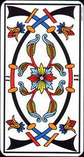 Como exemplo, trabalharemos com a série de Espadas de II a X. Curiosamente, a primeira letra – o II- , apresenta uma composição floral como é o caso dos IIII, VI e VIII.
