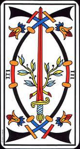 Apenas uma espada é vista em III, V, VIII, VIIII e de repente duas espadas em X, no meio de uma espécie de mandoria (que naturalmente tem sido comparada com a do arcano XXI… e o que você vê aqui?). Esta mandoria composta por tipos de faixas, forma um tecido nas duas extremidades da mandorla. Esta trama é reforçada segundo o seguinte ritmo: II e III, um único cruzamento; IV e V entrelaçando duas vezes dois elementos; VI e VII, entrelaçamento de três elementos; VIII e VIIII entrelaçamento de quatro elementos.