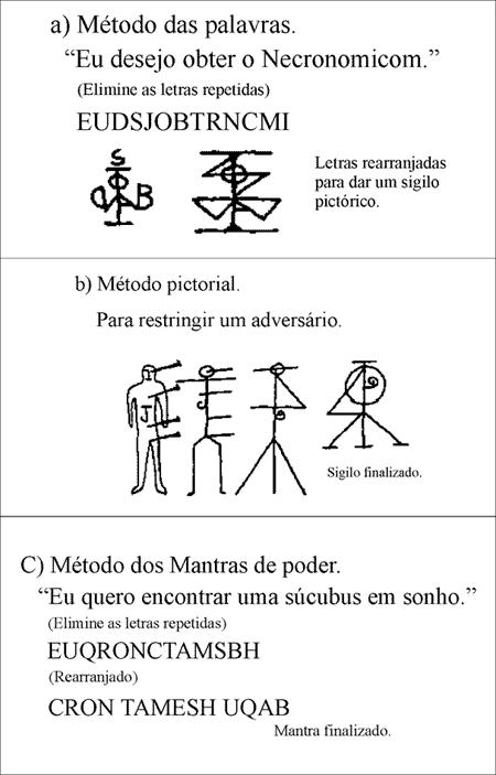 Na construção de um sigilo, o objetivo é produzir um glifo do desejo, estilizado para não sugerir o desejo de imediato. Não é necessário utilizar sistemas de símbolos complexos. A figura abaixo mostra como os sigilos podem ser construídos a partir de palavras, de imagens e de sons. Os assuntos de tema destes feitiços são arbitrários e não recomendados.