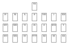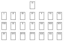 Para auxiliar nossas interpretações, podemos seguir qualquer um dos padrões estruturais descobertos pela primeira vez na ordem tradicional. Existem muitos desses padrões, e qualquer um deles nos dará uma maneira de entender as cartas. Durante os anos em que trabalhei com o tarô, achei valioso deixar o Louco de lado, como a carta principal, e dispor o resto em três fileiras de sete. (Para as razões por trás desse sistema, veja meu livro 78 Degrees of Wisdom, 78 Graus de Sabedoria.) Aqui está o padrão: