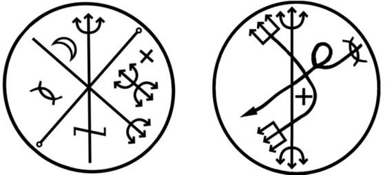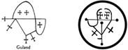 O primeiro ponto riscado de Guland que apareceu na internet parece uma adaptação ou fruto do exercício de memorização insuficiente do símbolo publicado no Grimorium Verum (esquerda) [22] . Quem viu o ponto no terreiro reproduziu isto (direita) [23]: