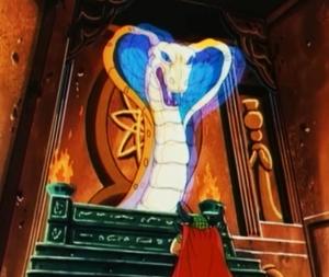 É claro que Set é descrito como “o deus do mal” por vários personagens ao longo do episódio, mas Ele realmente ajuda a deter Cobra no final, e Ele faz isso sem ferir ninguém. Melhor ainda, Ele é retratado em Sua forma correta como um cara grande e musculoso com a cabeça de Sua besta sagrada, o sha. Em um determinado momento, Ele assume a forma de uma serpente gigantesca, mas é claramente indicado que essa não é Sua verdadeira forma, e o contexto em que isso ocorre é bastante notável. Quando os Cobras O encontram pela primeira vez, Set pergunta se eles são “adoradores da Serpente”. Eles dizem que sim, e Ele Se transforma em uma grande cobra e ordena que todos se ajoelhem. Eles o fazem, e Set volta à Sua forma de sha e lhes dá o tesouro. Em seguida, os Cobras partem e Set os ataca no céu enquanto eles estão voando para longe. Do meu ponto de vista, toda essa troca é um truque para ver se as Cobras realmente sabem o que significa adorar Set. Ao se ajoelharem diante Dele enquanto Ele está em forma de cobra, elas provam que não sabem nada sobre Ele e que não veem diferença entre adorá-Lo e adorar Seu inimigo, Apep. Isso, por sua vez, incita o Grande Vermelho a atacar os bastardos podres justamente quando eles acham que venceram.