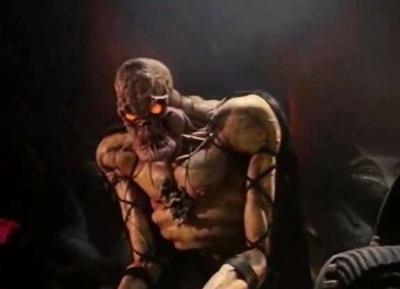 Acontece que um dos vilões dessa série é Set, que aqui é conhecido como Sutekh (como em Doctor Who). E, para ser sincero, esse deve ser o design mais original do Grande Vermelho que já vi em um filme (embora eu não queira dizer isso como um elogio). O Sutekh da Full Moon se assemelha a um Buda BDSM rechonchudo com um rosto que parece um crânio esculpido em um repolho estragado. Ele também tem dois olhos que brilham como laranjas da Flórida e tem até mamilos. (Mamilos, eu digo!) Aparentemente, essa versão de Set é responsável por criar o elixir mágico que dá vida aos fantoches de Toulon e Ele o quer de volta para que Ele possa usá-lo para desencadear o apocalipse de alguma forma (naturalmente). É claro que Sutekh está preso em algum tipo de dimensão alternativa (eu me pergunto de onde eles tiraram essa ideia), e Ele só é poderoso o suficiente para enviar versões muito pequenas de Si mesmo para o nosso mundo. Esses clones em miniatura são chamados de “Totens” e têm quase o mesmo tamanho das marionetes de Andre Toulon (o que significa que veremos muita ação entre marionetes contra marionetes).