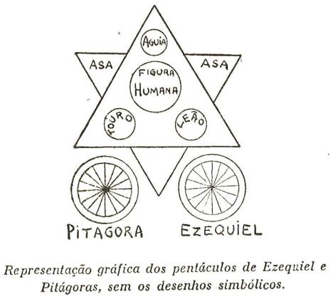 OS PENTÁCULOS DE EZEQUIEL E DE PITÁGORAS — Representado no duplo triângulo de Salomão comporta o querubim de quatro cabeças da profecia de Ezequiel. |