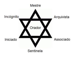 Os dois triângulos formam um hexagrama e em seu centro um último oficial de estola vermelha se posiciona perto do altar. Este oficial é o Orador, o guardião e porta-voz dos irmão e irmãs durante os rituais.