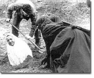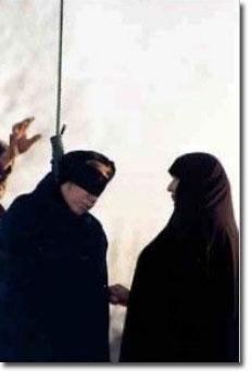 Foto de Hajiyeh Esmaelvand, mulher iraniana condenada à morte por apedrejamento. Seu crime: adultério. A condenada tem parte do corpo enterrado e uma multidão atira pedras de tamanhos definidos até que ela morra. É comum que a família do condenado tenha que fazer os preparativos para a execução.