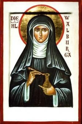 O nome Walburga é atribuído a uma santa cristã, de origem inglesa, que no século XVIII, na Alemanha, se tornou abadesa de um convento chamado Heidenheim (“lar dos pagãos”). Sua vida não foi marcada por nenhum evento especial; porém, após sua morte, em óleo milagroso começou a brotar de sua lápide e, por ter efeitos curativos, passou a ser recolhido pelos monges e distribuído aos necessitados. A igreja considerou o fato milagroso e Walburga doi canonizada.